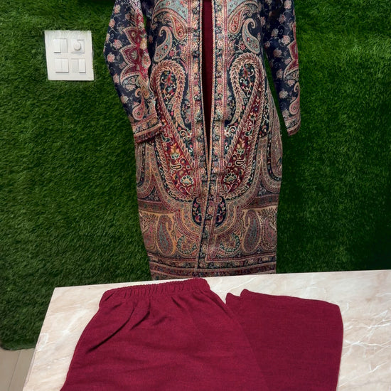 Maroon Premium Woolen Long Length Coord Set With Heavy Shrug (Partywear)